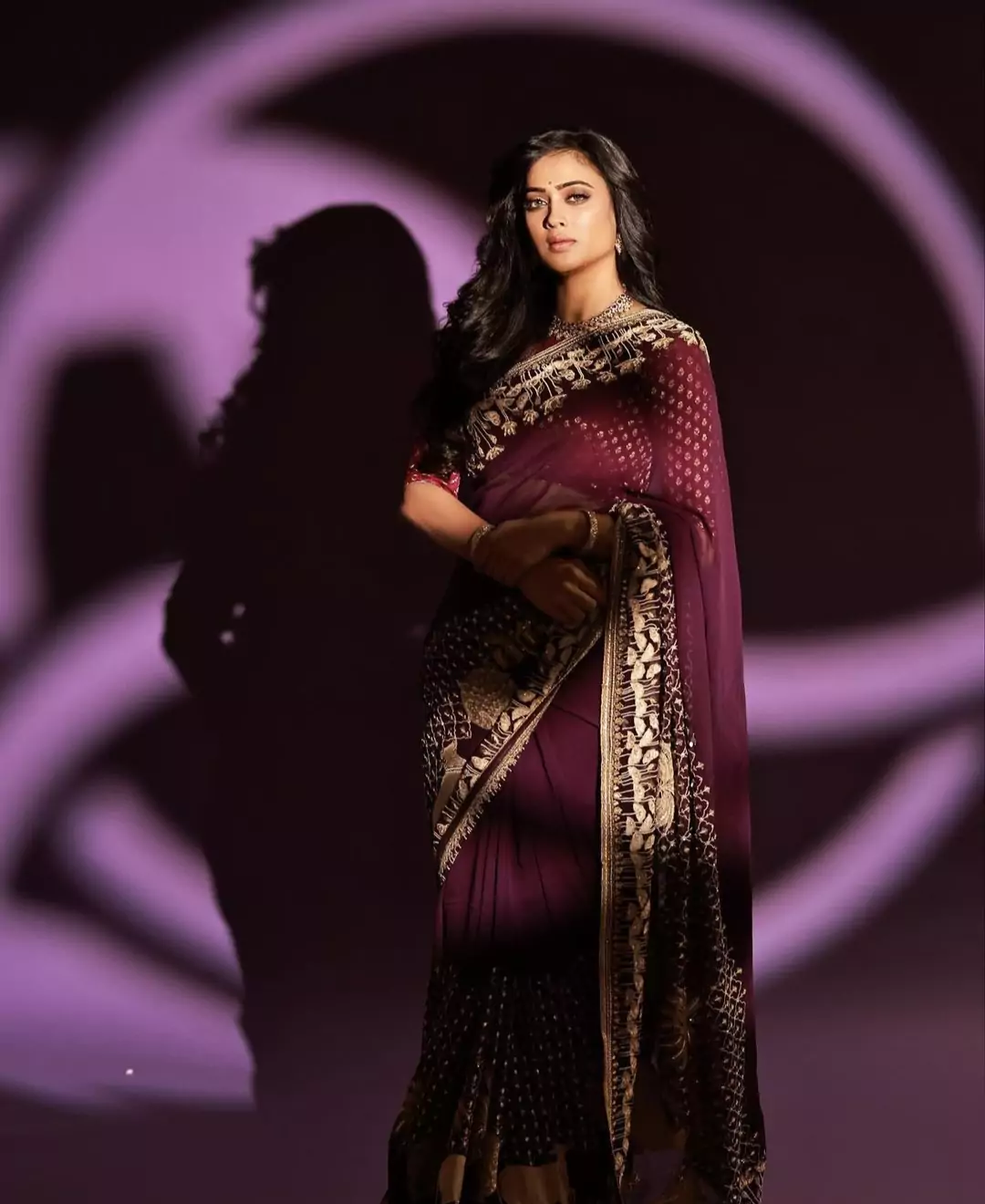 इस पर्पल साड़ी में श्वेता अपना कर्वी फिगर फ्लॉन्ट कर रही हैं साथ ही ऑपोजिट कंट्रास्ट वाला ब्लाउज लुक इस साड़ी लुक को और भी इनहैंस कर रहा है।