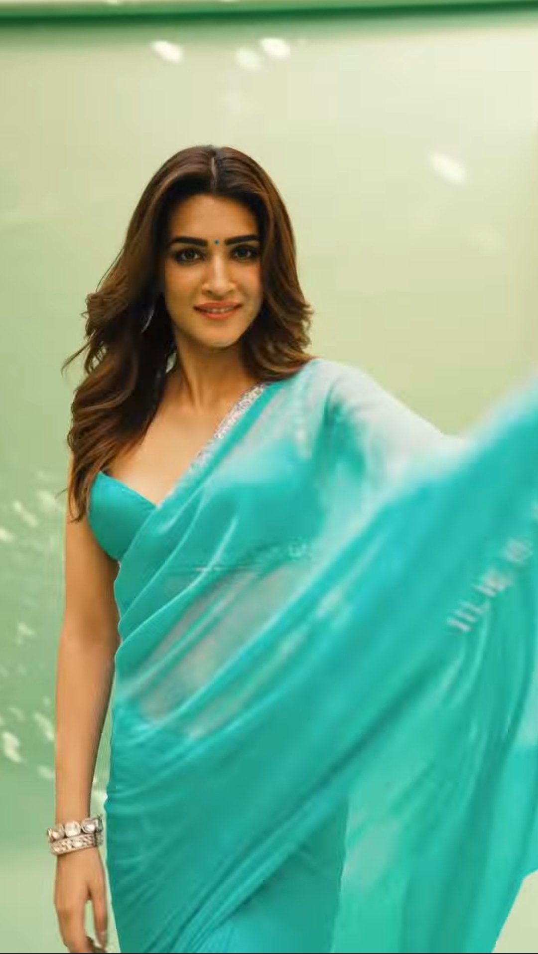 कृति के माथे पर सजी बिंदी उनके लुक में चार चाँद लगा दे रही है।