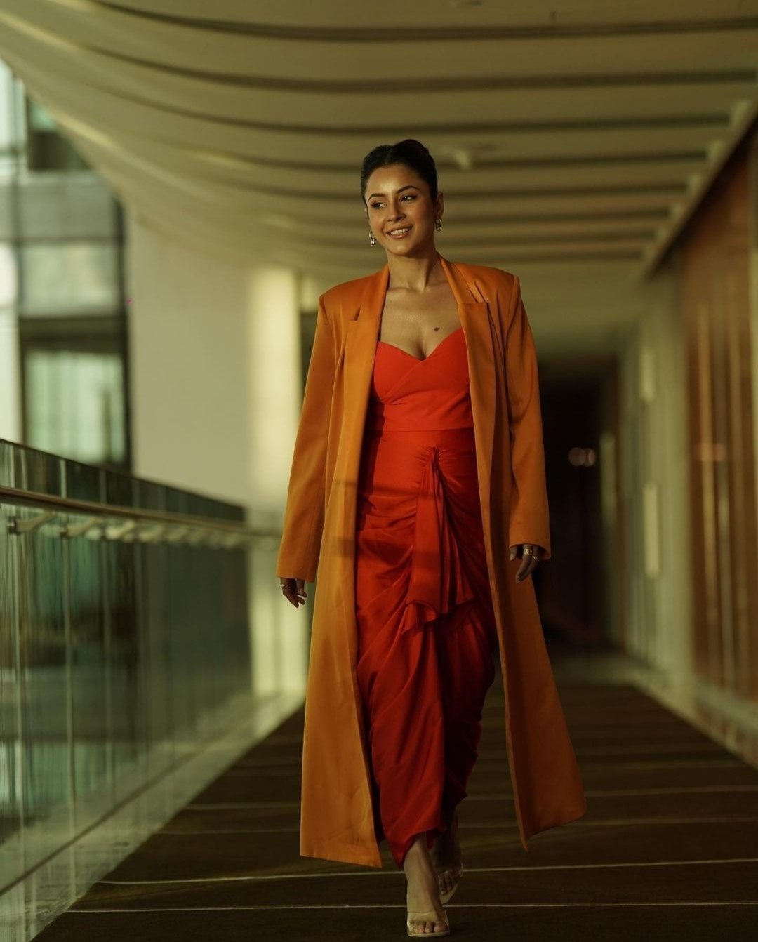 इस स्कर्ट और टॉप के साथ में शहनाज ने ऑरेंज ओवरकोट पेयर किया हुआ है।