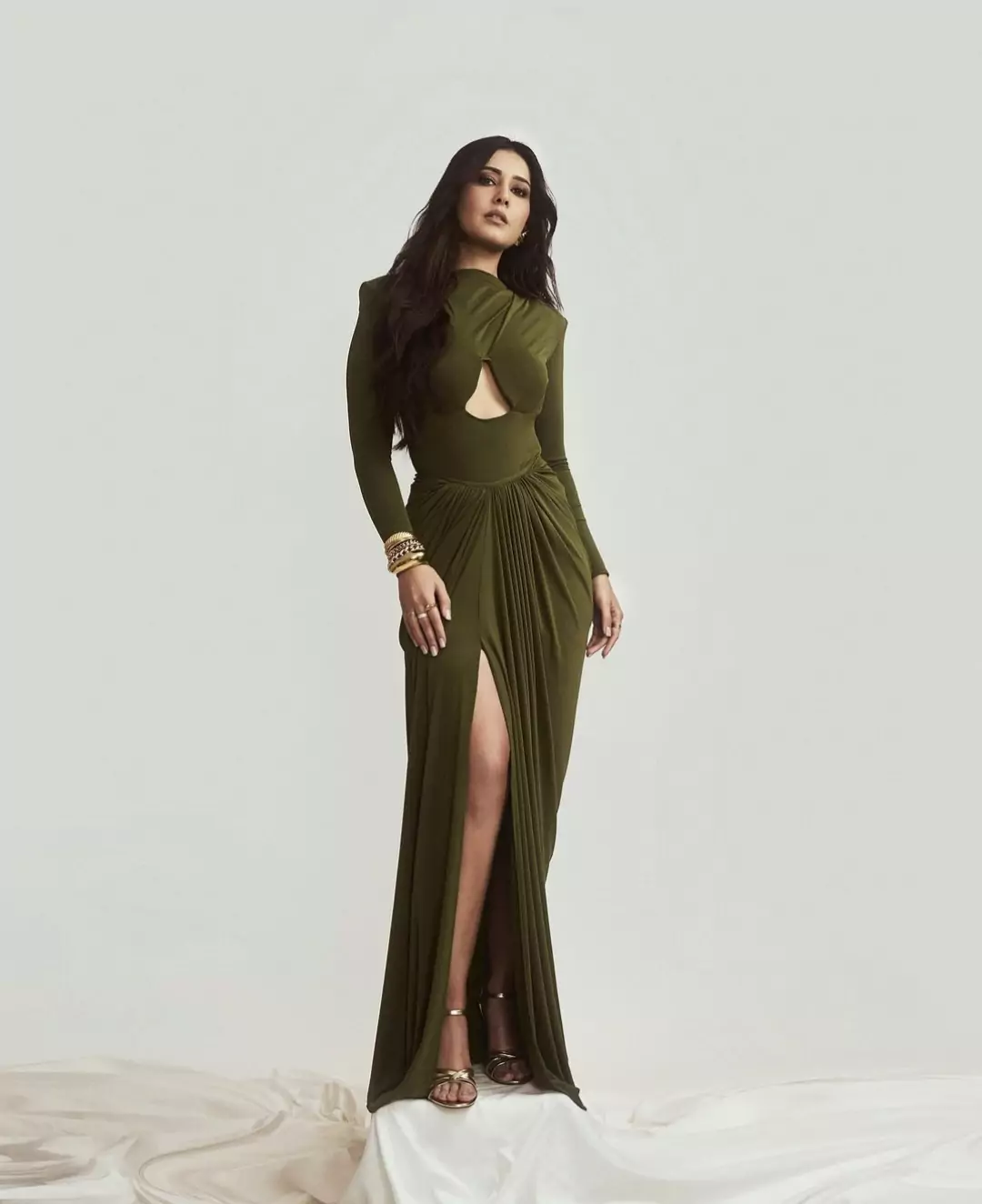 इस अवॉर्ड शो में राशि खन्ना एक क्लासी ऑलिव गाउन  पहन कर पहुंची थी।