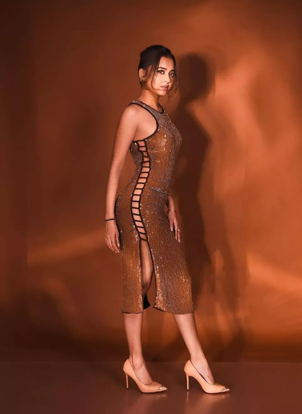 तस्वीरों में तेजस्वी एक शिमरी ड्रेस “ जिसको साइड से कट आउट लुक दिया गया है” तेजस्वी को काफी सेंशुअस लुक दे रहा है।
