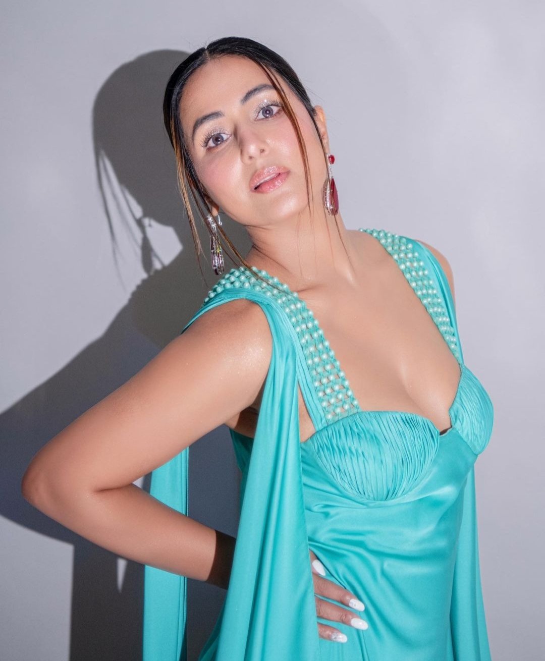 इन तस्वीरों में हिना ने एक खूबसूरत गाउन पहन रखा है। जिसके स्लीव्स पर पर्ल लगे हुए हैं।