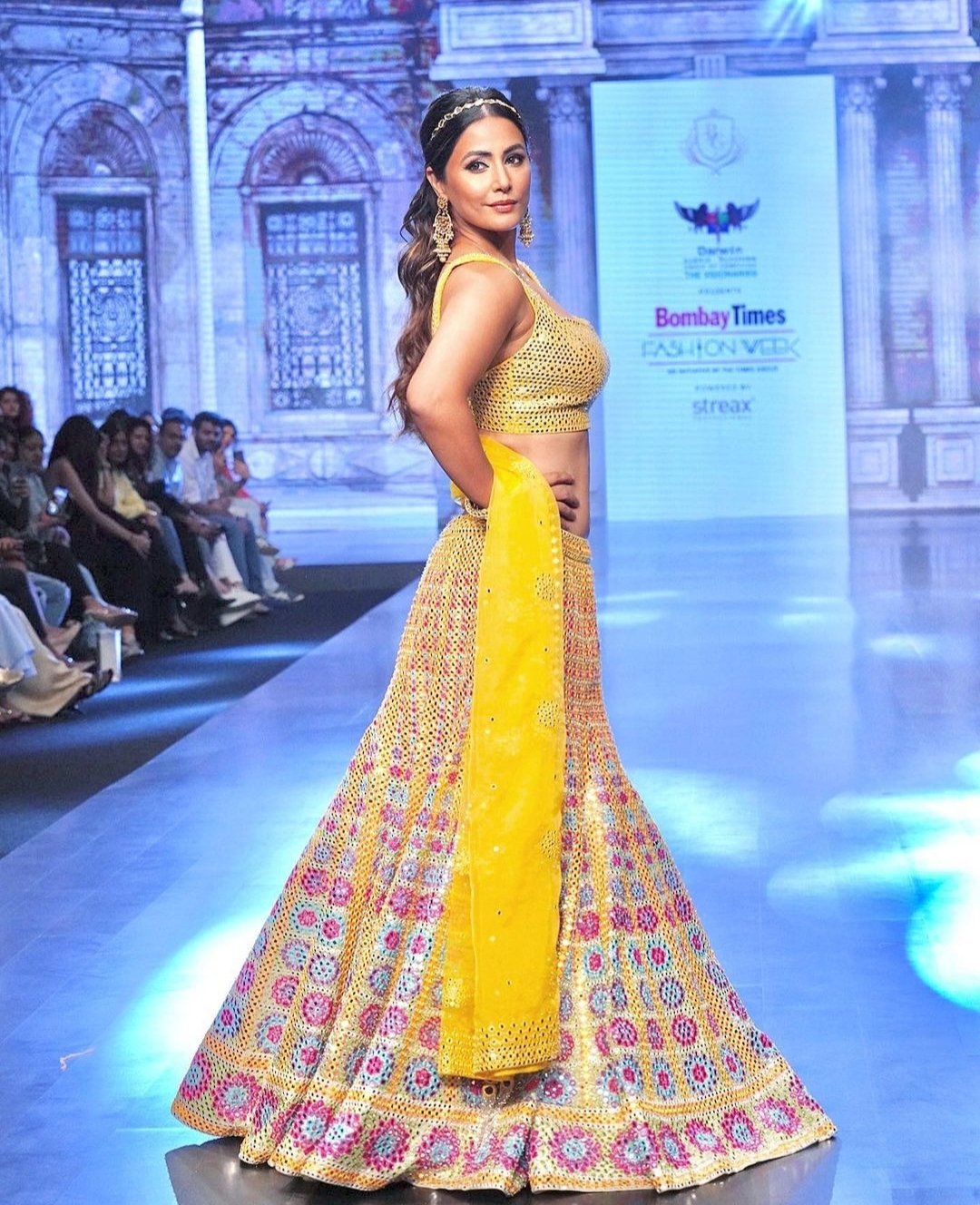 मिरर वर्क लहंगा पहनकर हिना ने रैंप वॉक किया।