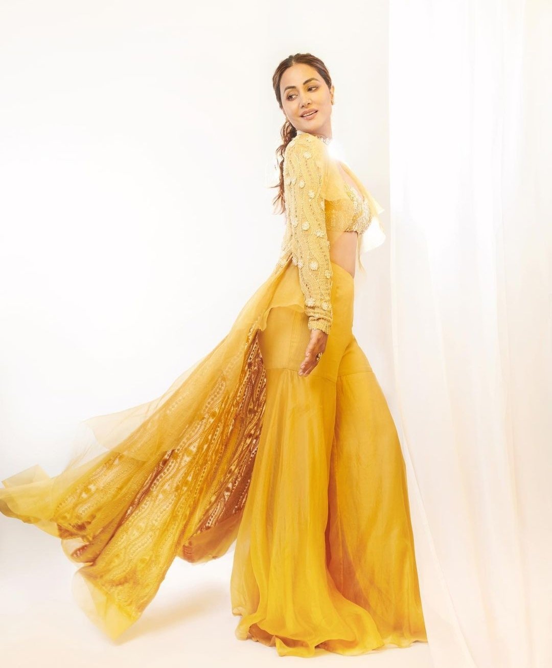 हीना ने अपने इस लुक के लिए एक पीले रंग का आउटफिट चुना।