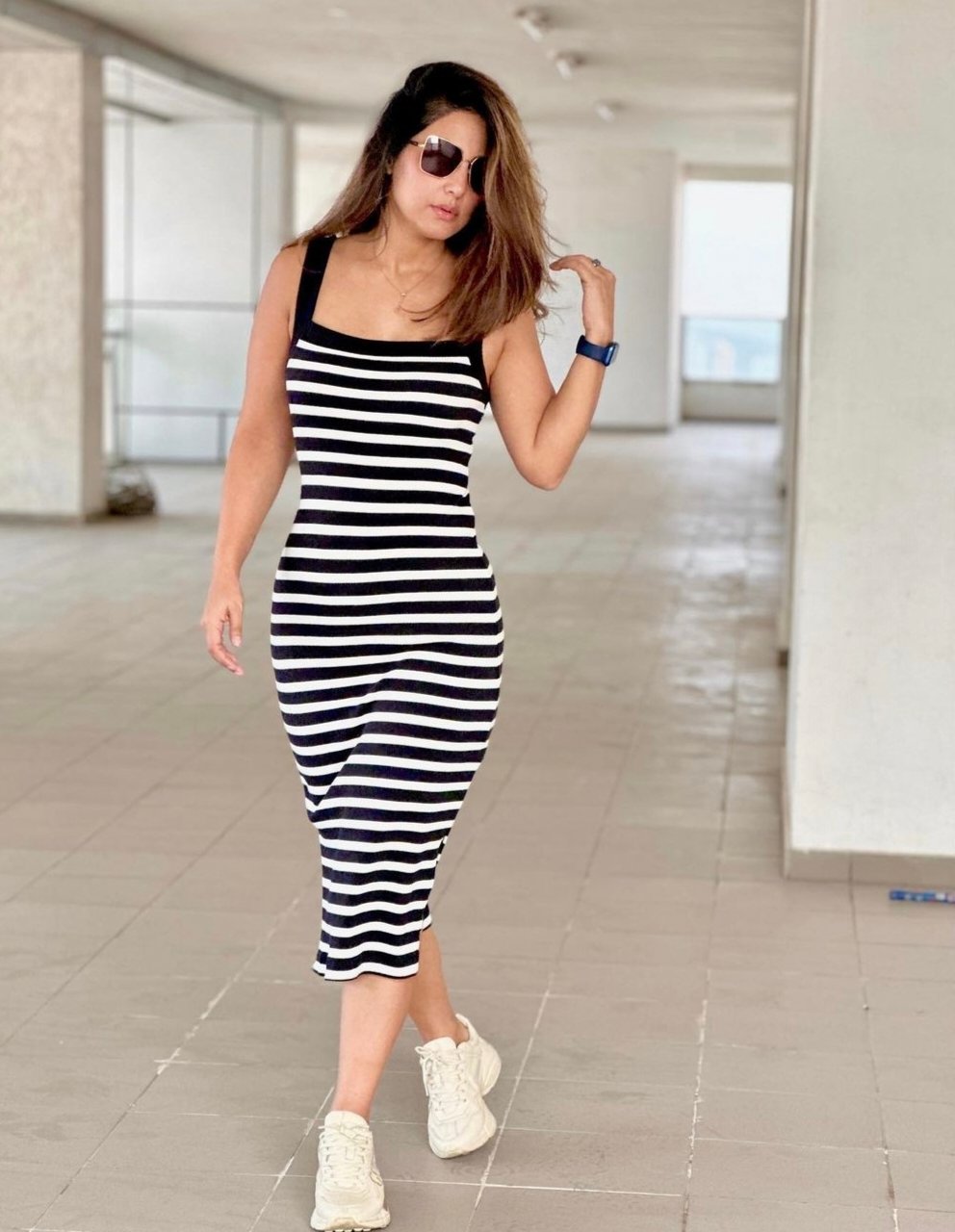 हाल ही में  हिना ने अपनी कुछ तस्वीरें सोशल मीडिया पर शेयर की हैं। जिसमें उन्होंने ब्लैक एंड व्हाइट बॉडीकॉन ड्रेस पहन रखा है।