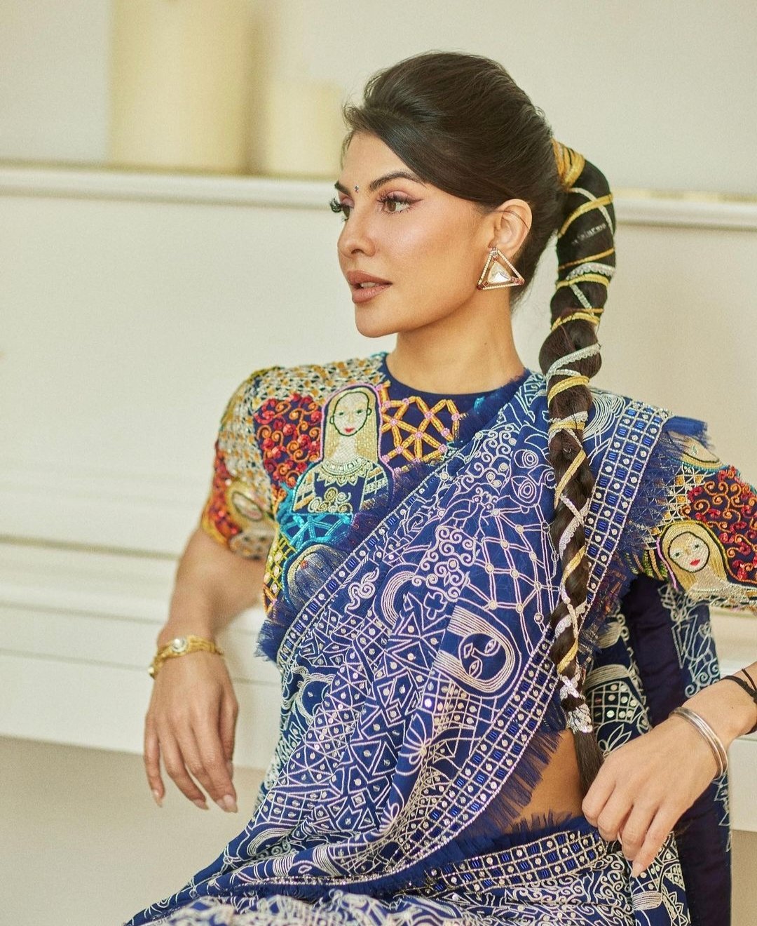 तस्वीरों में जैकलिन एक खूबसूरत ब्लू साड़ी पहने हुए नजर आ रही हैं।