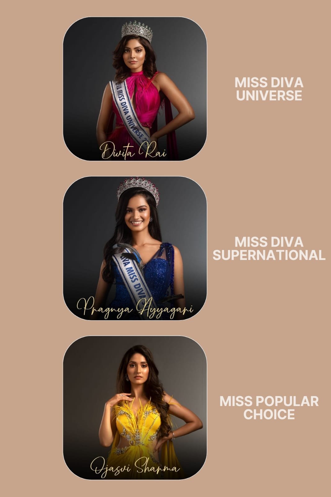 Miss diva contest is organized for represent india for Miss universe, which is part of Femina Miss India, Miss Supernational is also sent to represent India.