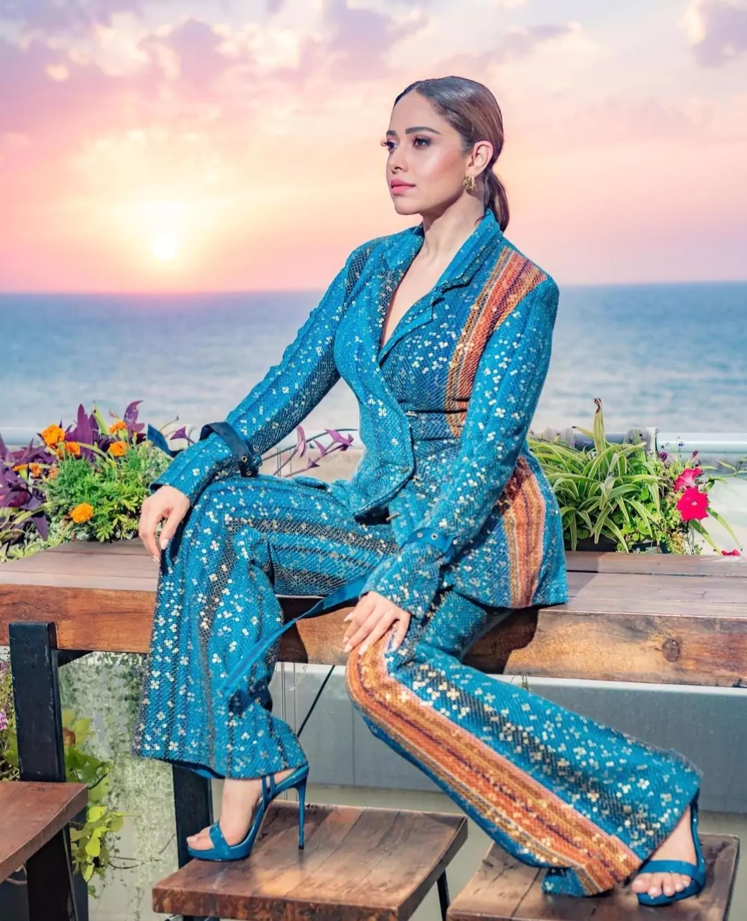 शिमरी ब्लू ब्लेजर और पैंट  में नुसरत का लुक बिल्कुल एक पटाखा कुड़ी वाला है।