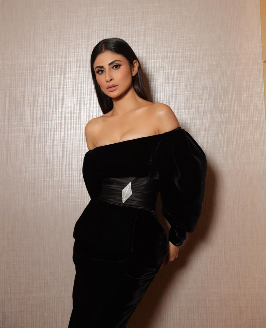 डिज़ाइनर ऑफ शोल्डर ड्रेस में मौनी ने दिए कातिलाना पोज।
