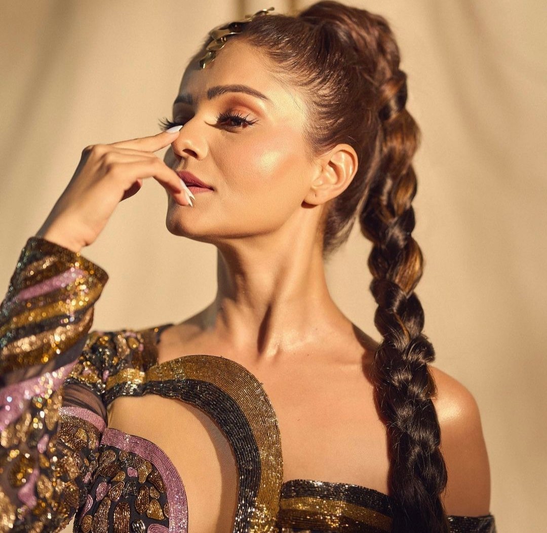 रुबीना ने अपने बालों में लॉन्ग-ब्रेड क्रिएट किया है साथ ही एक मांग टीका भी सजाया है।