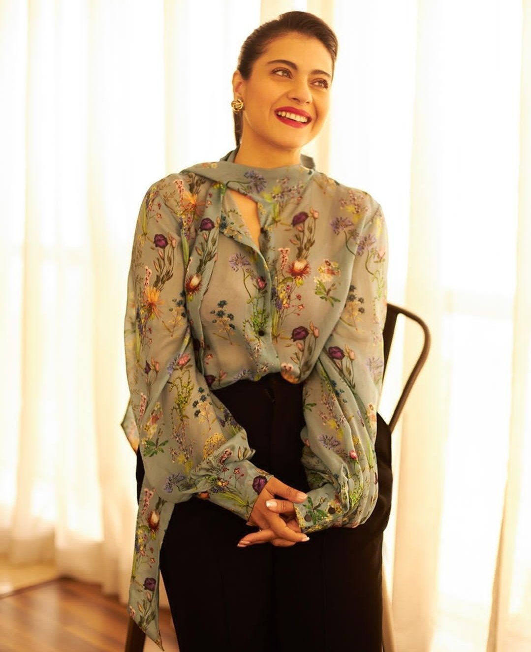 काजोल के इस फ्लोरल टॉप में स्कार्फ का डिजाइन बनाया गया है जोकि बेहद खूबसूरत लग रहा है।