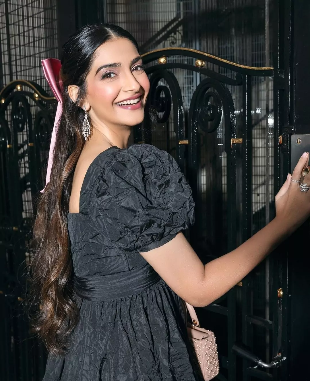 स्मॉल हैंडबैग सोनम के लुक को और भी इन्हैंस कर रहा है।