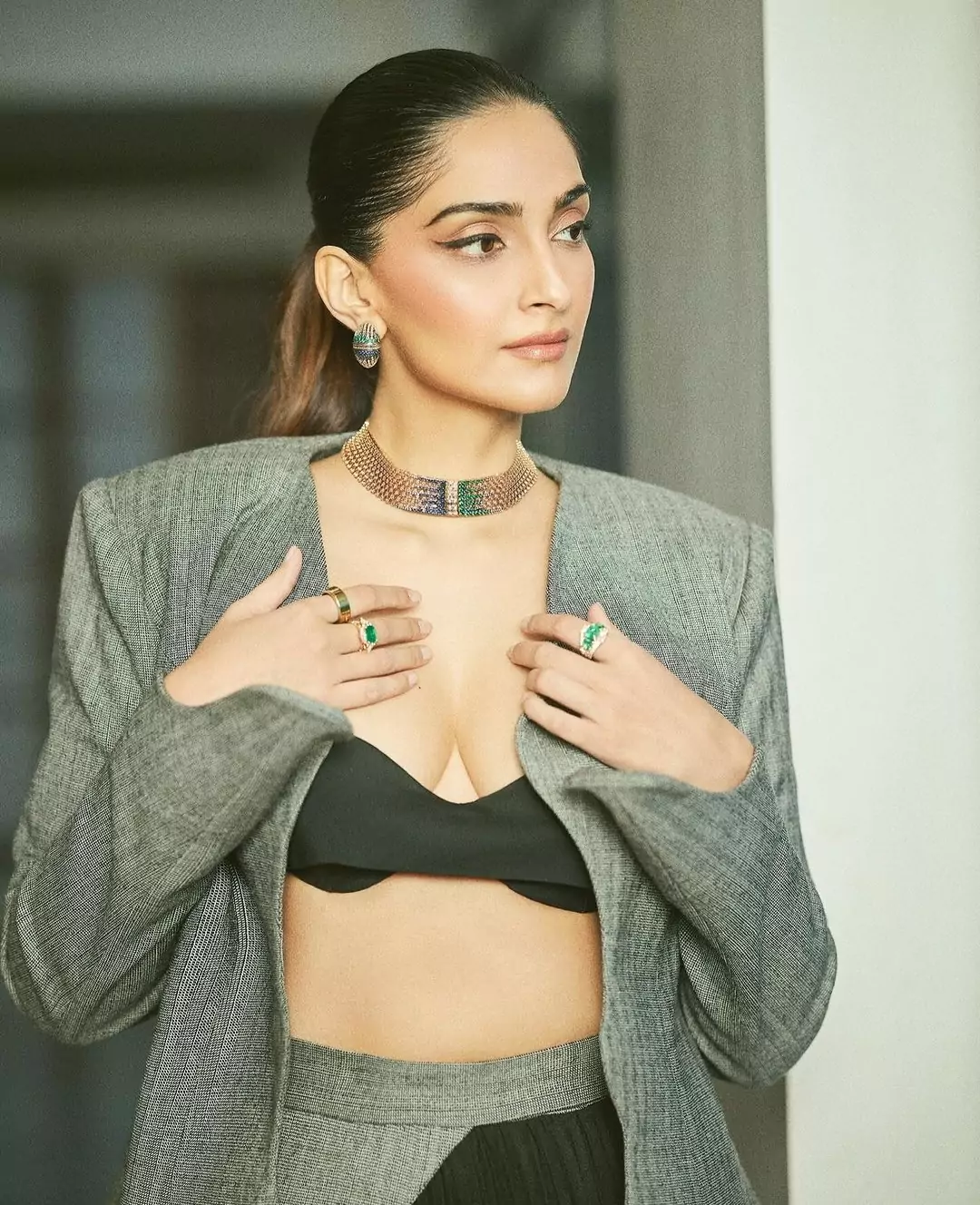 सोशल मीडिया पर सोनम ने ब्लैक प्लेटेड स्कर्ट और डीप नेक ब्रॉलेट के साथ स्कैलप्ड ब्लेजर पहने हुए फोटो शेयर किया है।