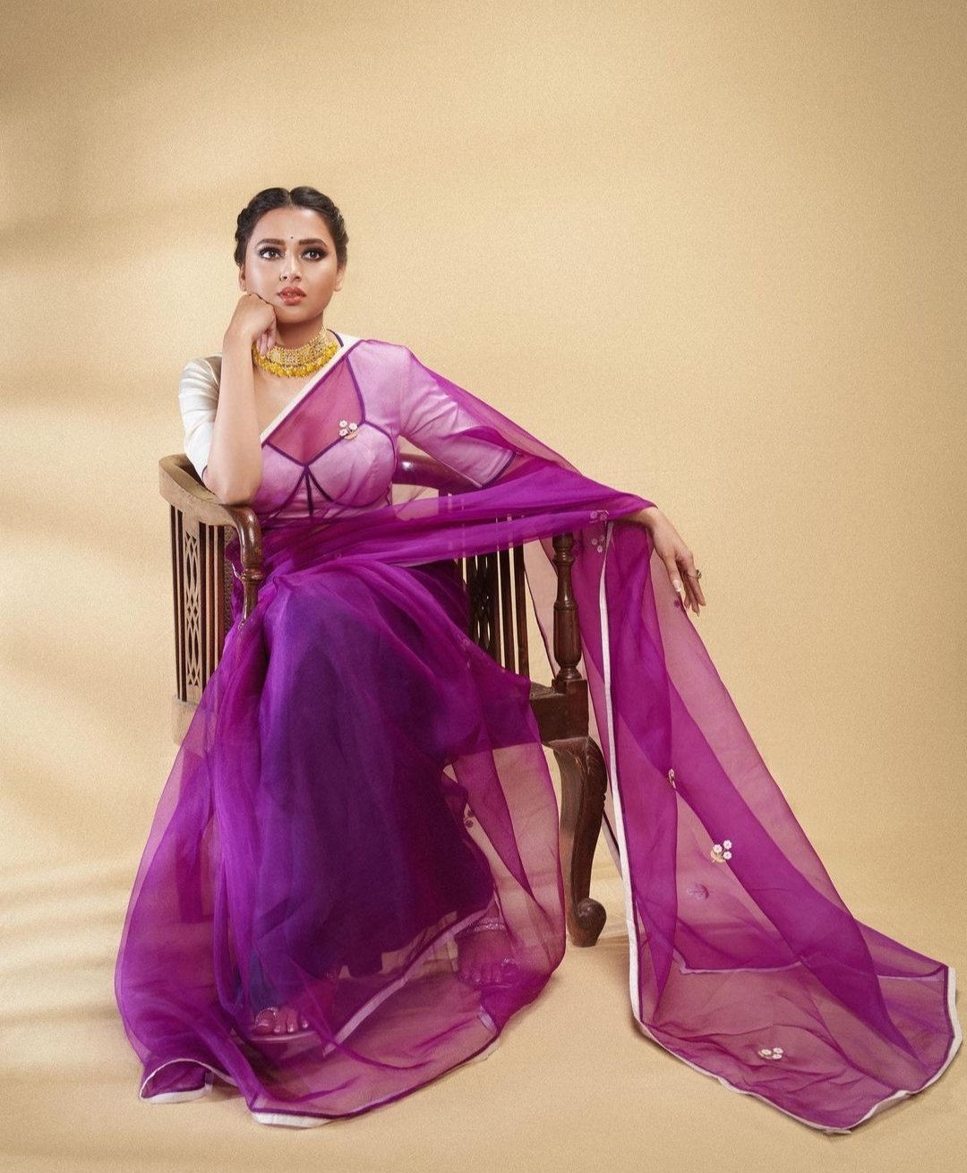 प्लेन पर्पल साड़ी और सफेद चोली में तेजस्वी काफी जंच रही है।