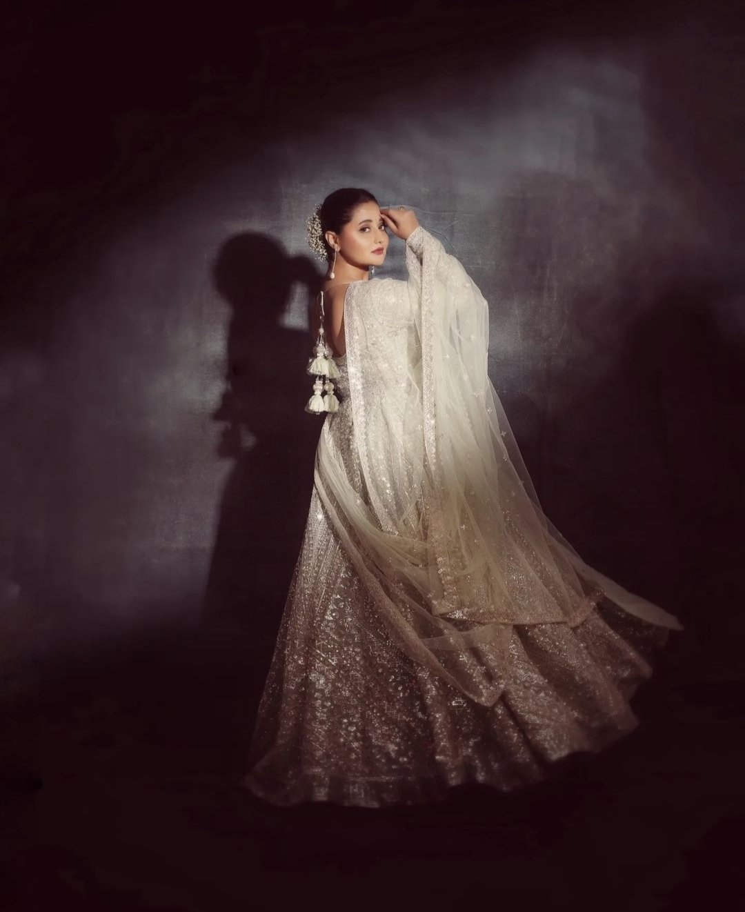 व्हाइट शिमरी आउटफिट में रश्मि ने दिखाया अपने हुस्न का जादू।